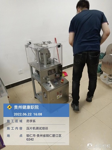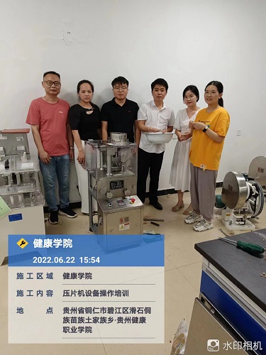 2022年6月22日,我廠銷售部李經理及技術人員王工前往貴州健康職業學院對購置的旋轉式壓片機、單沖壓片機進行安裝調試,并就設備的使用對學院老師進行培訓。