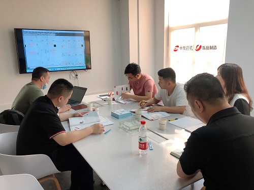 期間,在會議室,總經理何靖之向肖總一行人詳細介紹了生產線的整個生產流程、技術優勢和生產能力,以及現有的市場狀況和未來發展前景,并就其公司場地設計、設備配置、擺放等問題進行了交流,隨后,在設備展廳參觀了公司生產的設備,并對設備的工藝和使用提出了寶貴的意見。